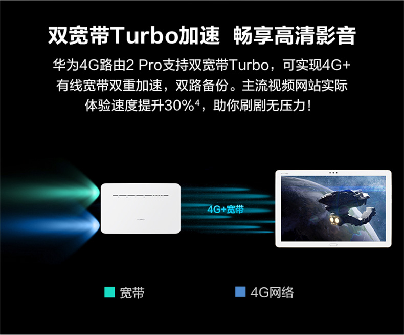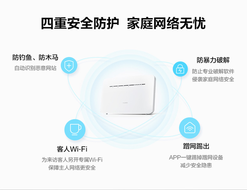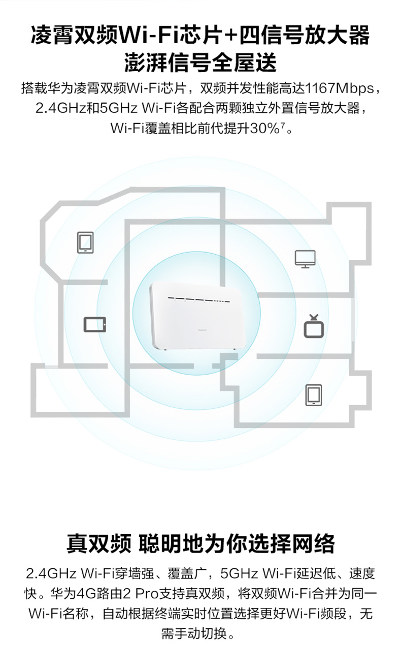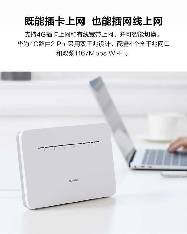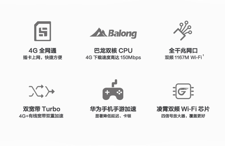 全网通,插卡即用;巴龙双核CPU,双宽带turbo,凌霄双频WIFI芯片,全千兆网口