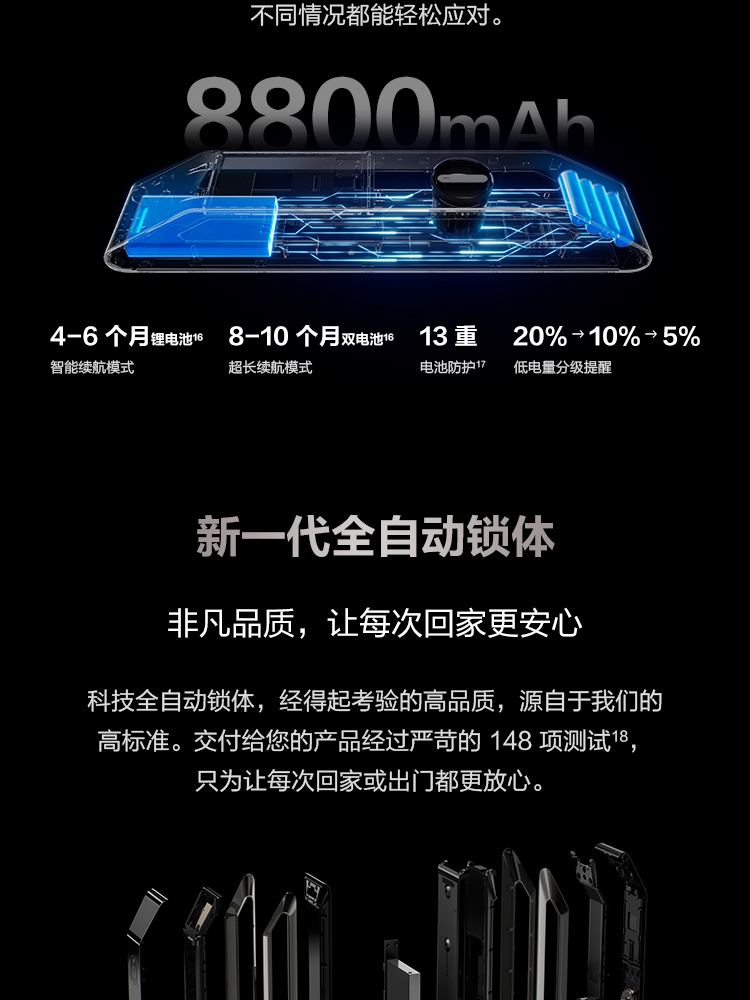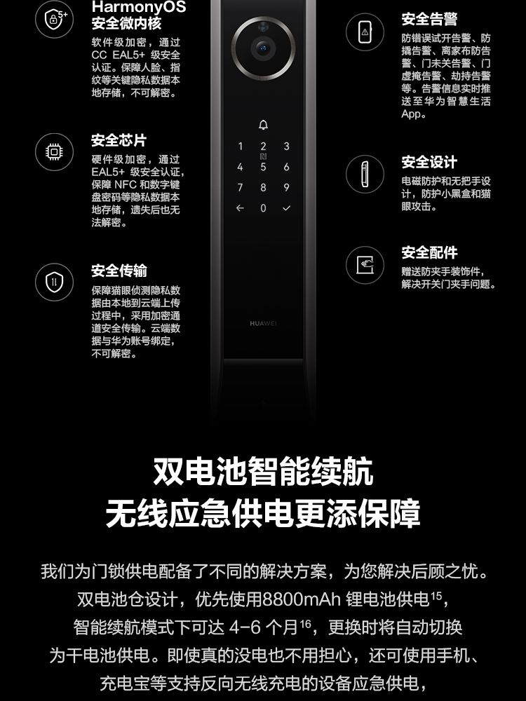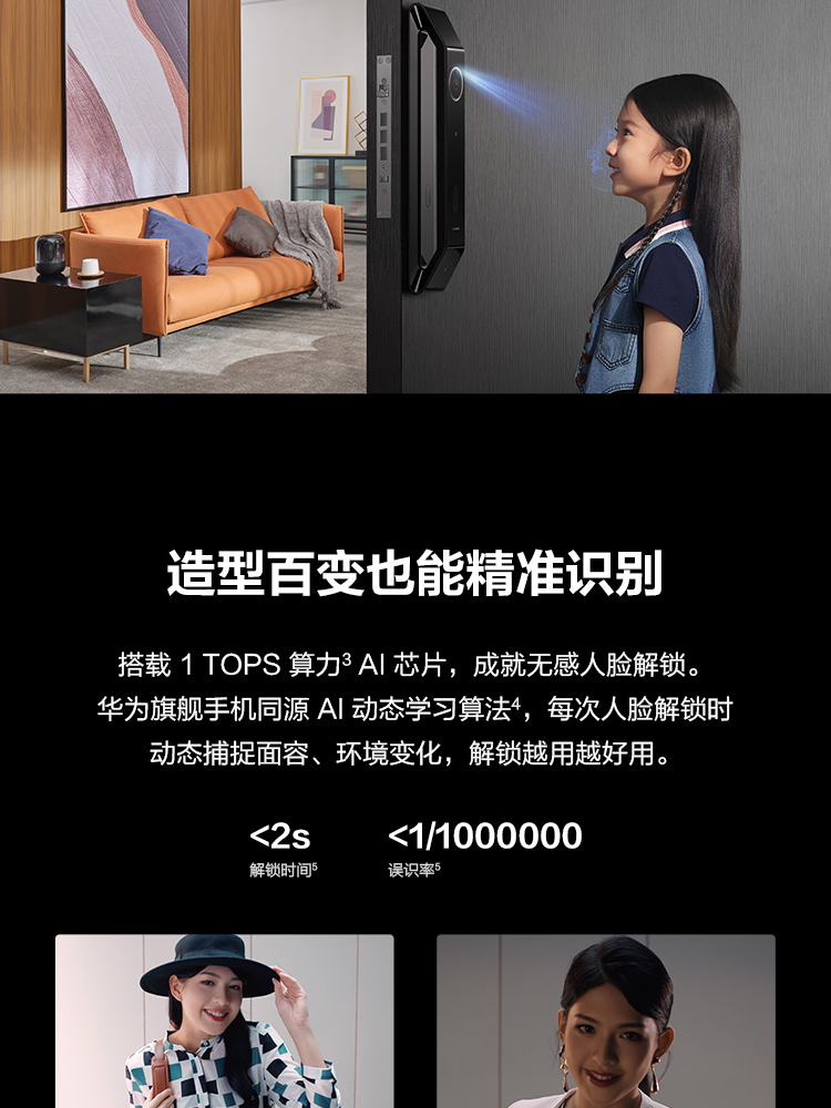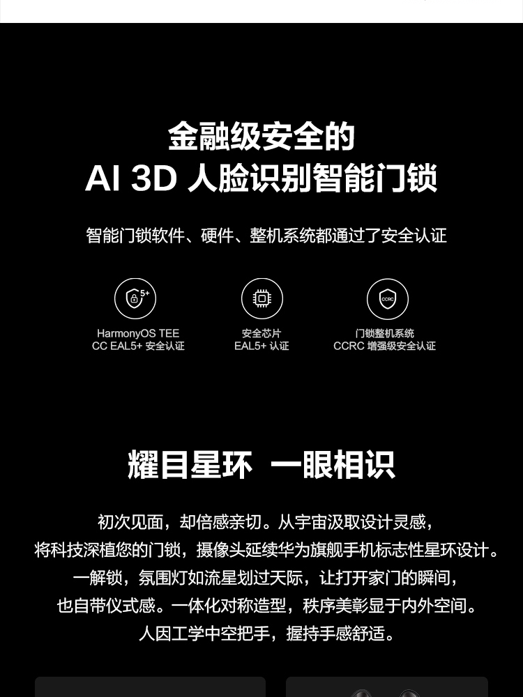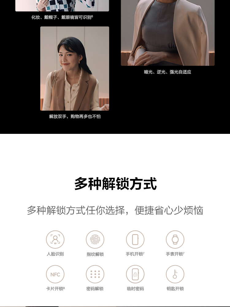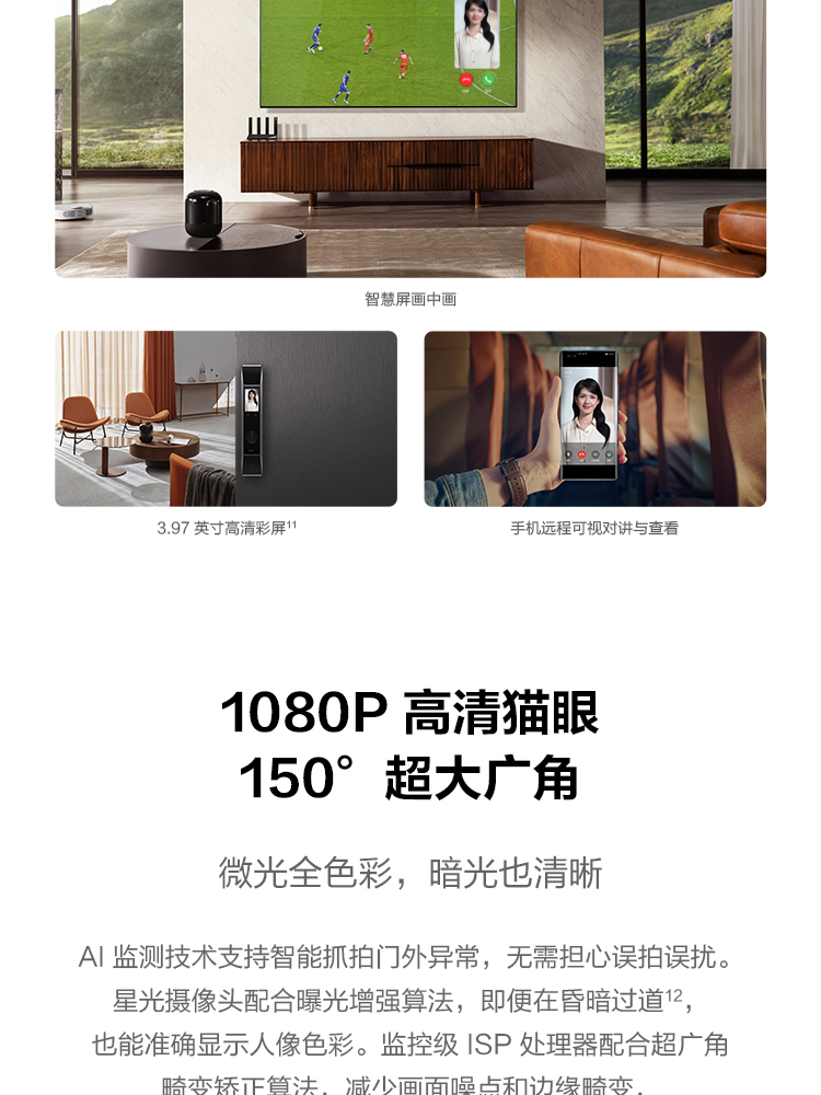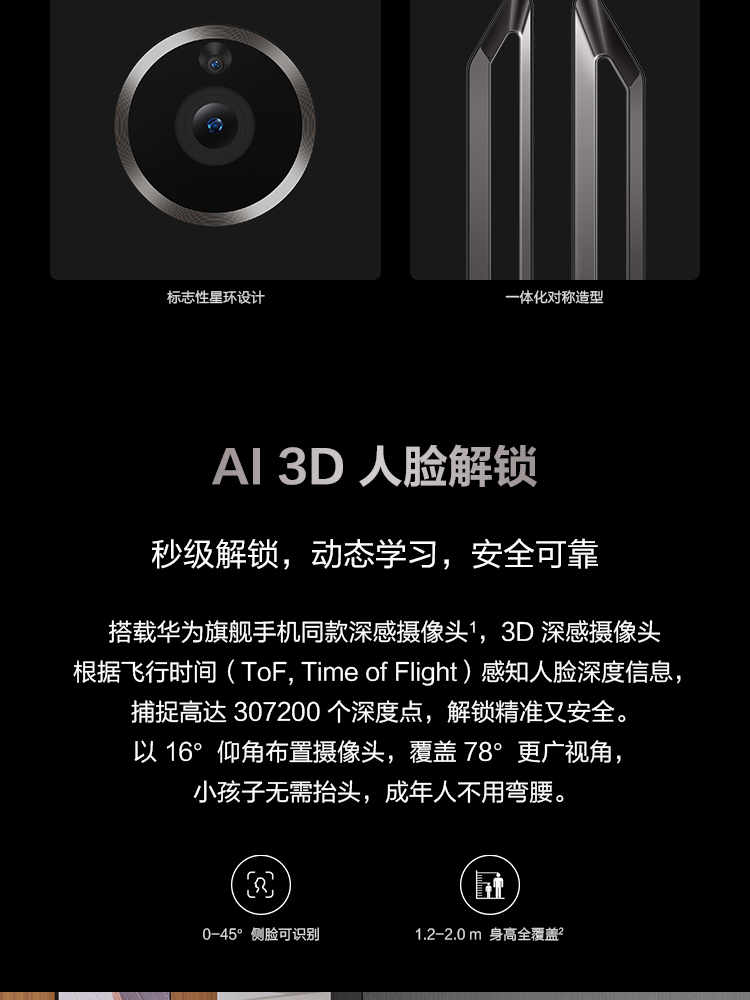 9大开锁方式,双电池超长续航,无线应急供电,AI 3D人脸解锁,1080P高清分布式可视猫眼,150°超大广角,更清楚更安全